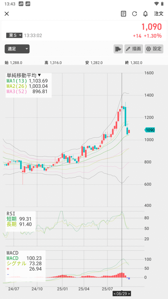 わずか1週間のうちに過熱感を増し、「8/29」にはRSI100に突入し、MACDはピークに近づき飽和の傾向です。