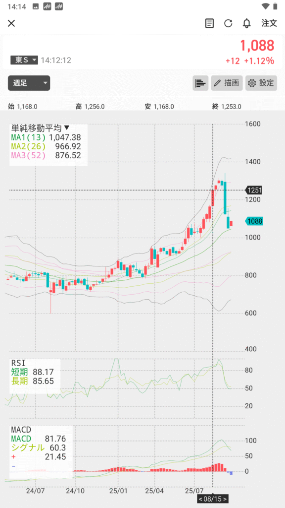 まとめると、日足のRSIやMACDは必ずしも高値と完全にはリンクしていません。このように日足では、指標が先行してシグナルを出すことが多くあります。一方、週足チャートでは、RSIやMACDが株価の動きと比較的うまく連動しており、中長期的な過熱感やトレンドの判断に役立ちます。